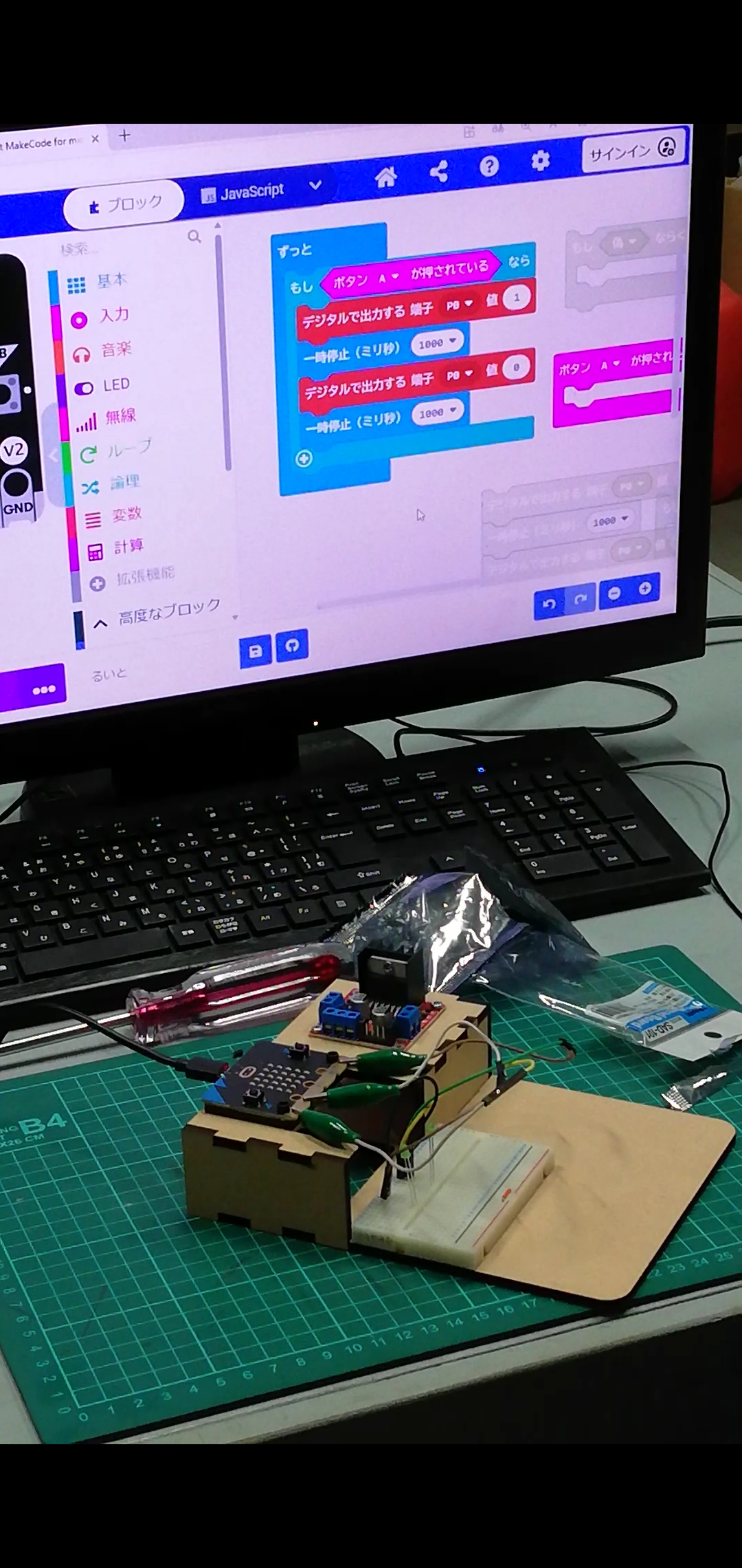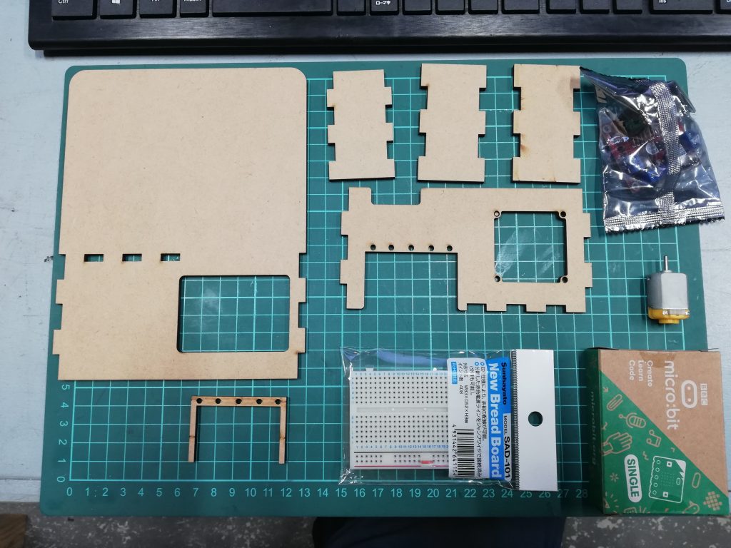 今回はmicrobitを使用して色々な制御をおこなうにあたり、前段階としてマイコンやモータードライバーを固定する土台を製作することにしました。電子工作をする際に、基板が固定されていると配線作業がしやすくなるためです。